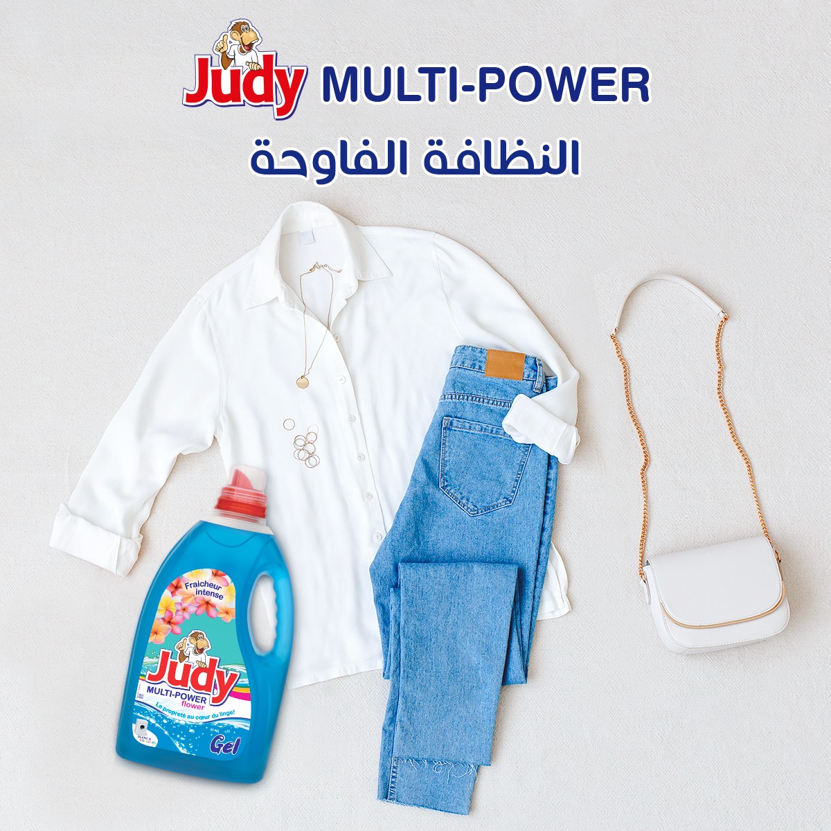 Judy Linge Multi-Power fait partie de la gamme Entretien du Linge Judy, conçue pour offrir un linge propre, frais et intensément parfumé à chaque lavage.  Ce détergent liquide, conçu pour le lavage automatique de tous types de linge, blancs comme colorés. Grâce à sa formule enrichie, il pénètre au cœur des fibres pour éliminer les taches les plus tenaces tout en respectant les tissus. Le résultat ? Un linge propre, éclatant et délicatement parfumé.